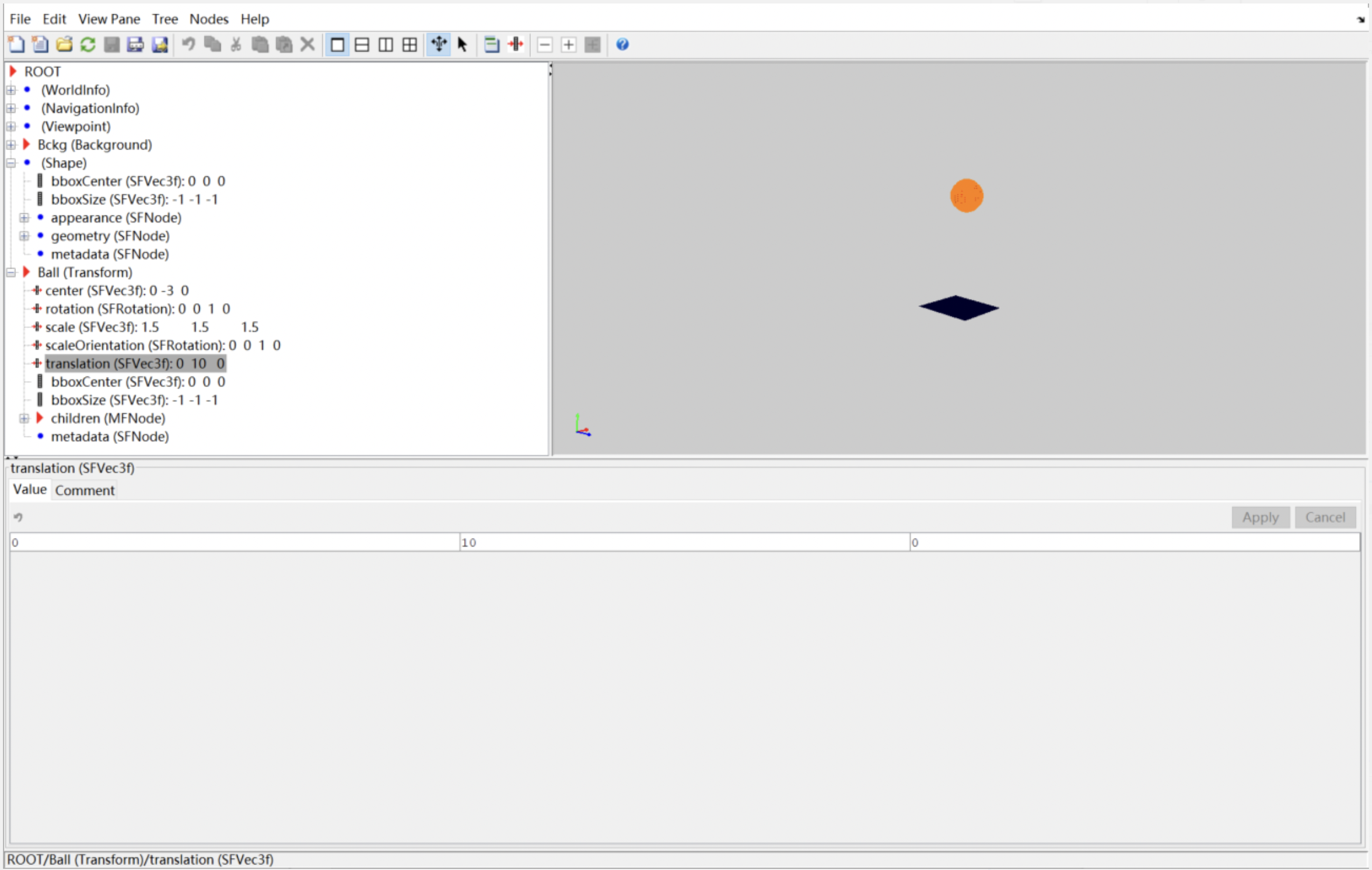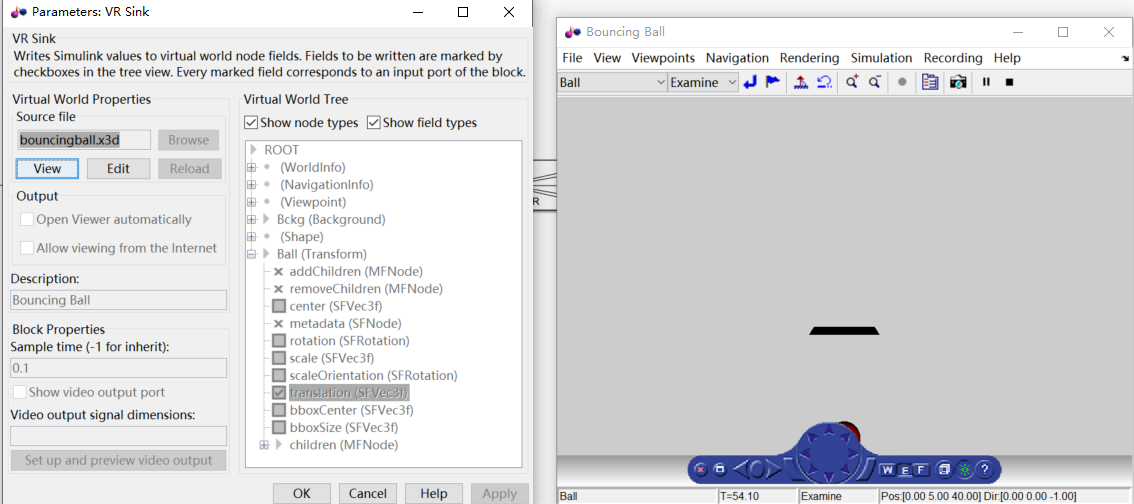 可以看到Position的输出没问题,但是小球怎么是倒着跳的?通过多轮尝试,发现可作为输入接口的除了center,还有个translation(平移),点选他替换center作为接口再仿真看看: