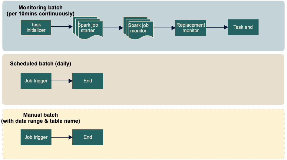 我们利用平台团队封装的Spring Batch管理更新任务,按照日期将每天的数据划分为一个子任务。通过Spring Batch实现的Continuously Job保证在同一时刻子任务在运行的唯一性,避免产生任务竞争问题。对于过往数据的更新,我们将Batch任务分类,除了日常任务之外,还可以手动触发给定时间范围内的数据修正任务(如下图)。