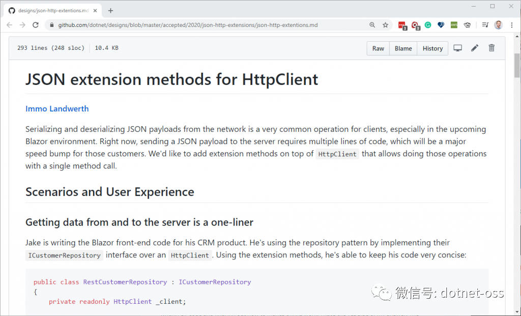最开始,Immo Landwerth 发现在HttpClient中处理Json很麻烦,于是他在github提了一个json扩展的建议,里面包含了遇到了哪些问题,然后如何改进。