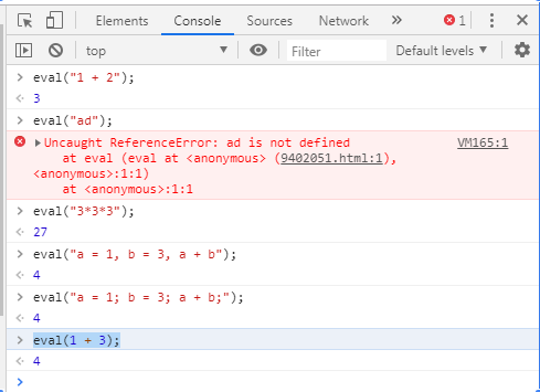 6、eval():函数用于计算表达式字符串,或者用于执行字符串中的JS代码,如果参数中没有合法的表达式和语句,那么会抛出异常。
