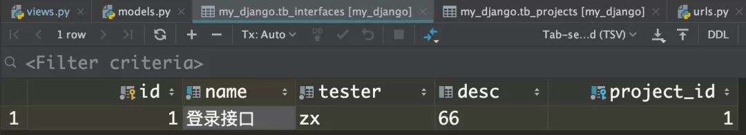 {'sql': "SELECT `tb_projects`.`id`, `tb_projects`.`name`, `tb_projects`.`leader`, `tb_projects`.`tester`, `tb_projects`.`programer`, `tb_projects`.`publish_app`, `tb_projects`.`desc` FROM `tb_projects` INNER JOIN `tb_interfaces` ON (`tb_projects`.`id` = `tb_interfaces`.`project_id`) WHERE `tb_interfaces`.`name` = '登录接口' LIMIT 21", 'time': '0.001'}