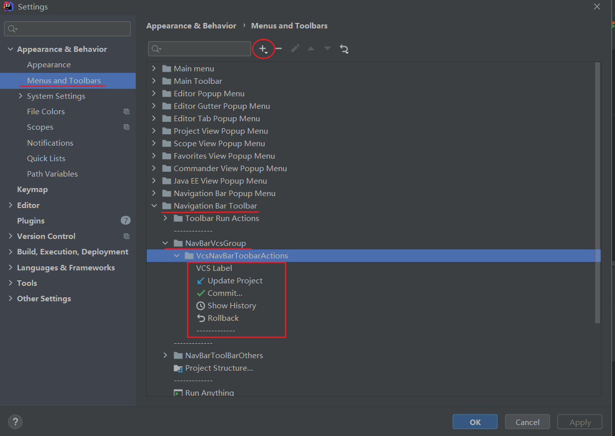 File-》Settings-》Menus and Toolsbars-》找到Navigaction Bar Toolbar 下拉框-》选择VcsNavBarToobarActions 然后点击上方➕号 添加到工具栏