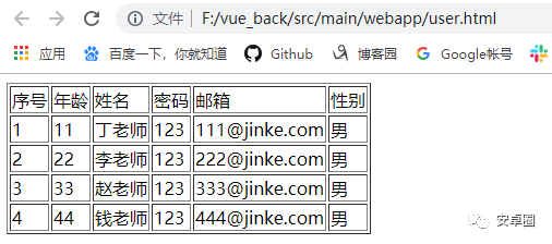 <html><head><meta charset="UTF-8"><title>v-fot遍历对象</title><script src="https://cdn.jsdelivr.net/npm/vue/dist/vue.js"></script><script src="https://unpkg.com/axios/dist/axios.min.js"></script></head><body><div id="app"><table border="1"><tr><td>序号</td><td>年龄</td><td>姓名</td><td>密码</td><td>邮箱</td><td>性别</td></tr><tr v-for="(user,index) in userList"><td>{{user.id}}</td><td>{{user.age}}</td><td>{{user.username}}</td><td>{{user.password}}</td><td>{{user.email}}</td><td>{{user.sex}}</td></tr></table></div></body><script src="js/user.js"></script></html>