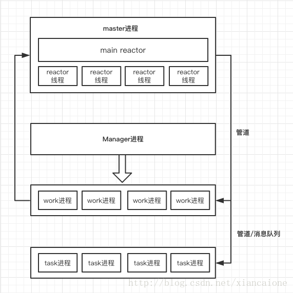 3.6.1、可以理解为Reactor就是nginx,Worker就是php-fpm。Reactor线程异步并行地处理网络请求,然后再转发给Worker进程中去处理。Reactor和Worker间通过UnixSocket进行通信。