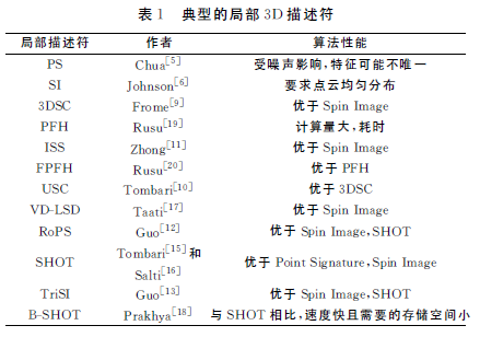 点特征直方图(PFH)和快速点特征直方图(FPFH)是Rusu R B等人提出的相对早期的局部特征描述子。采用统计临近点对夹角的方式构造特征描述子,这也是局部特征描述子构造的典型方式,在此基础上形成了基于局部特征匹配的目标识别和位姿估计的经典框架,如下图所示。表1对典型的局部三维描述符进行了总结,并对不同方法的性能进行了比较。