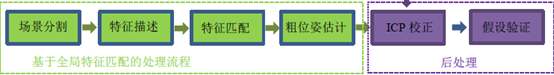 基于全局特征的方法需要从背景中将目标物体分割出来,通过描述和比对三维物体形状中的全部或者最显著的几何特征来完成物体的识别,这类方法被广泛地应用于3D物体的表示匹配和分类中。全局特征将视角作为一个特征,建立多视角下的2.5D 模型特征库,目标识别结果和位姿由这些模板给出,基于全局特征的识别框架如图所示。这种方式的缺陷是需要对场景进行分割,分割的好坏会直接影响识别定位的结果。