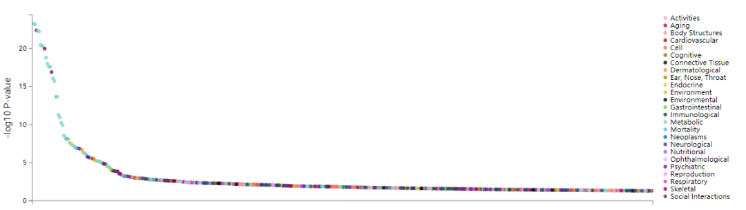 对于某个基因或者SNP位点,查看在不用表型中的关联分析结果,绘制如下所示的散点图