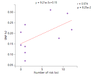 上图展示的是risk loci个数和snp遗传力之间的相关性,每个点表示一个表型的gwas结果。
