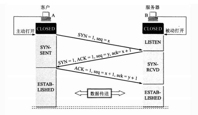**第一次握手:**建立连接时,客户端发送syn包(syn=j)到服务器,并进入SYN_SENT状态,等待服务器确认;SYN:同步序列编号(Synchronize Sequence Numbers)。