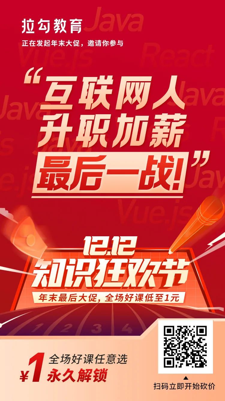 相信关注我公众号的朋友们,都是追求进步的朋友。拉勾教育的 12.12 年末最后知识大促,全场专栏都可以砍价到 1 元。