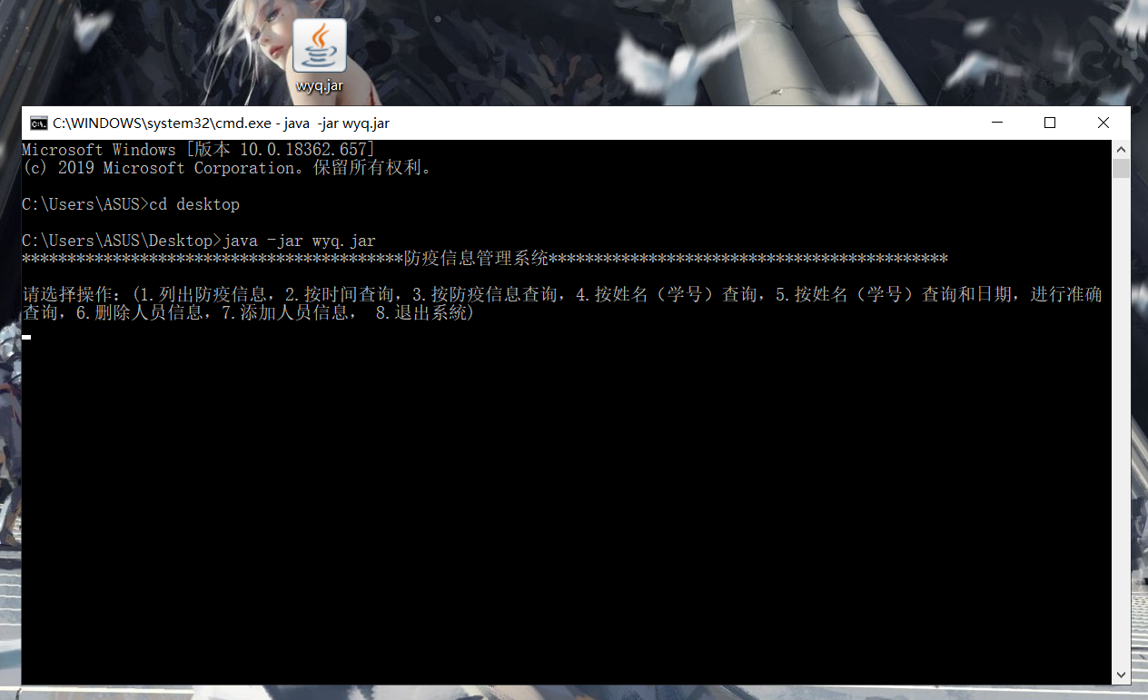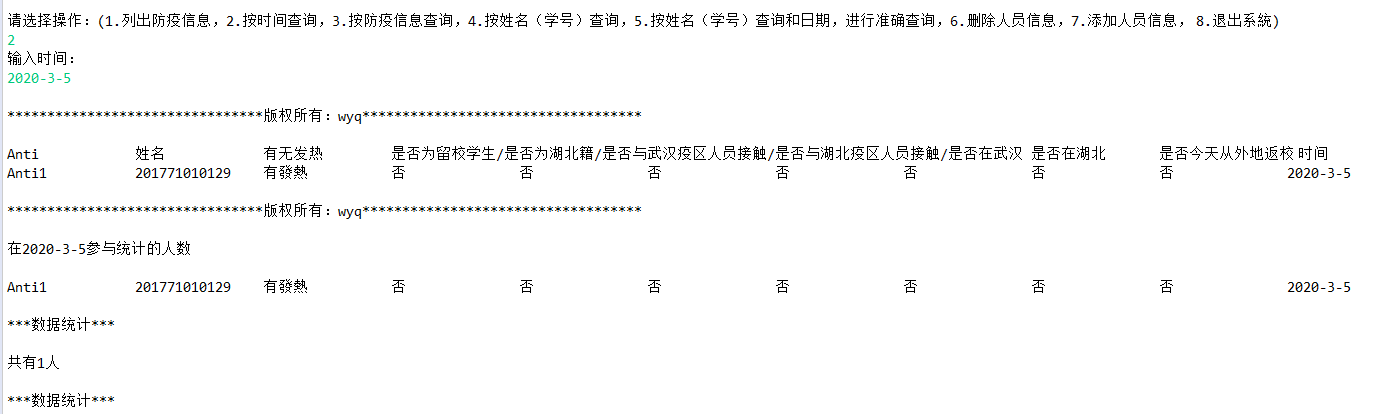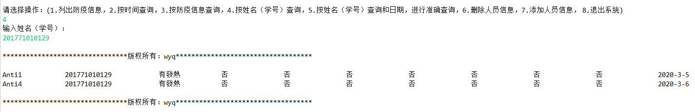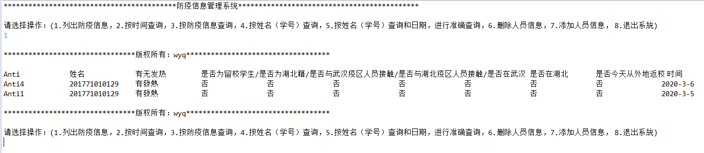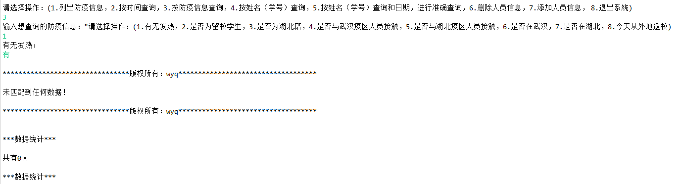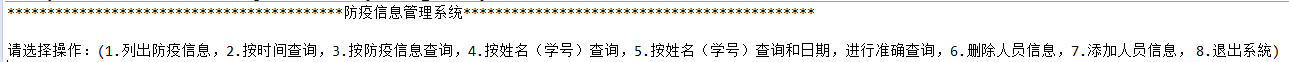 System.out.println("请选择操作:(1.列出防疫信息,2.按时间查询,3.按防疫信息查询,4.按姓名(学号)查询,5.按姓名(学号)查询和日期,进行准确查询,6.删除人员信息,7.添加人员信息, 8.退出系統)");