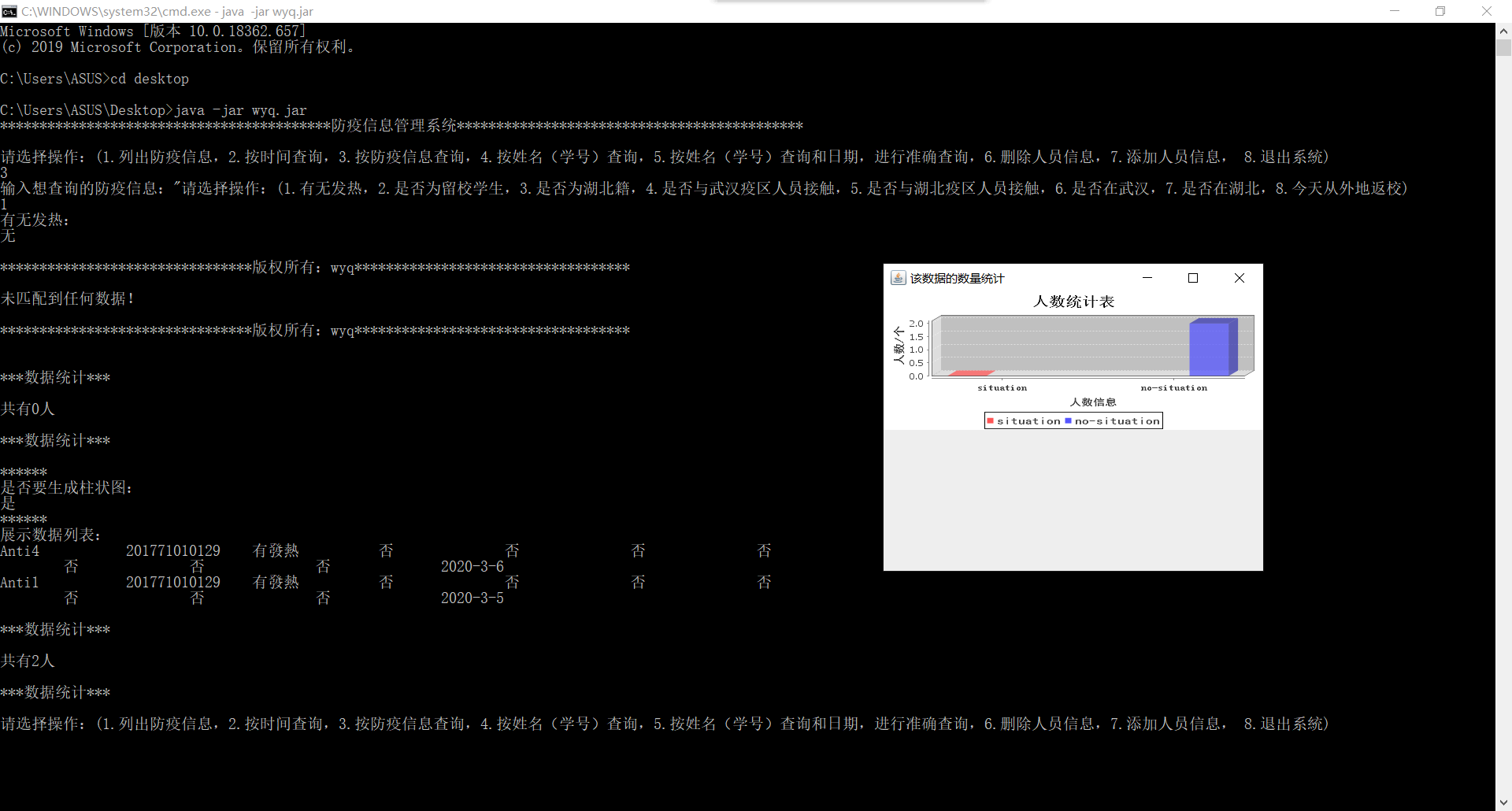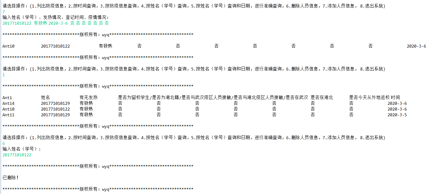 - 可以存储以下信息:学号;与本人相关的防疫信息a.有无发热,b.是否为留校学生,c.是否为湖北籍,d.是否与武汉疫区人员接触,e.是否与湖北疫区人员接触,f.是否在武汉,g.是否在湖北,h.今天从外地返校<span style="color:red">(参照学校的学生疫情情况每日上报表)</span> -<span style="color:blue">扩展功能</span> -既然是疫情上报系统,并且是面向管理人员的,那么肯定要有相应的管理功能。 -因此,我在里面添加了删除人员信息和增加人员信息的功能。