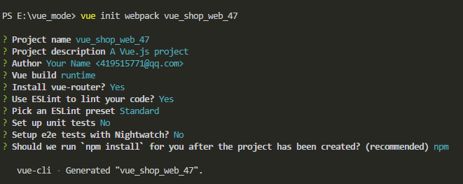 五、install vue-router?是否安装vue的路由插件,需要就选y,否则就n(以下均遵循此方法)