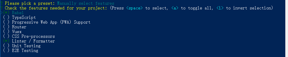 vue-cli 内置支持了8个功能特性,可以多选:使用方向键在特性选项之间切换,使用空格键选中当前特性,使用 a 键切换选择所有,使用 i 键翻转选项。