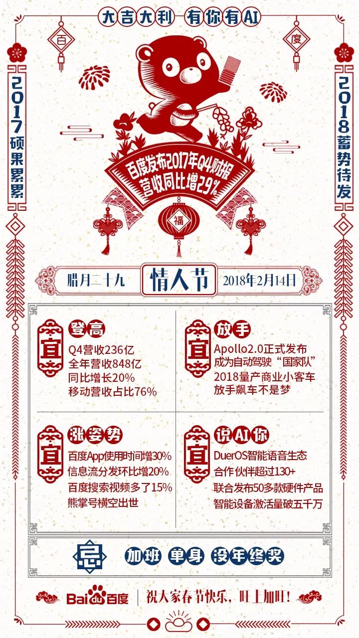 北京时间2月14日(美国东部时间2月13日),百度(NASDAQ:BIDU)公布了2017年第四季度及全年未经审计的财务报告。本季度百度营收为236亿元人民币(约合36.2亿美元),同比增长29%,其中移动营收占比76%;2017年度总营收为848亿人民币(约合130.3亿美元),同比增长20%。预计2018年第一季度将实现29%—36%的增长(不计已出售业务),超出了华尔街的预期。在AI赋能下,百度业务的增长速度将持续提升。