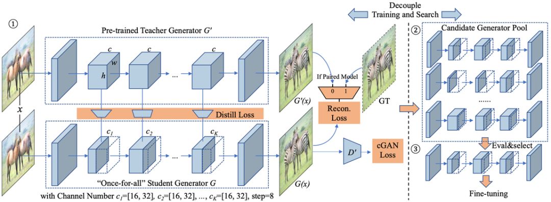 研究者依照最近 one-shot 的 NAS 方法的研究,将模型训练与架构搜索脱钩。首先,训练一个支持不同通道数量的「once-for-all」网络,其中的每个子网络都经过了同等训练。图 3 阐释了整个框架。研究者假设原始的教师生成器有