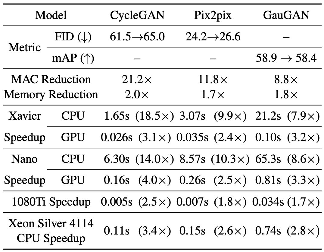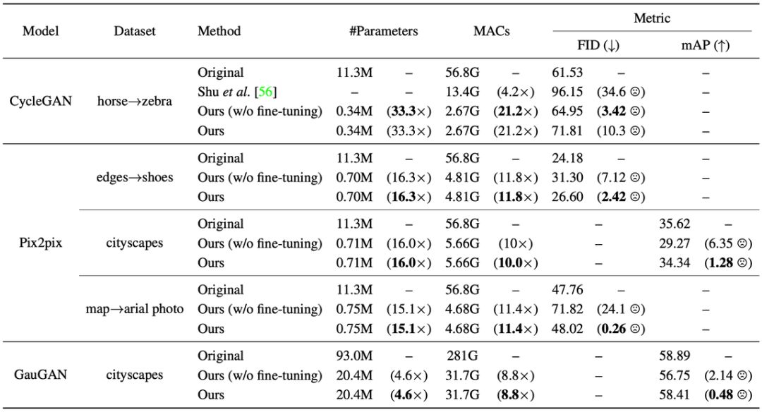 通过大量的实验,团队已证明了此方法可以将 pix2pix,CycleGAN 以及 GauGAN 三种广泛使用的 GAN 模型计算量减少至 1/9 到 1/21,同时还不会损失生成图像的保真度。