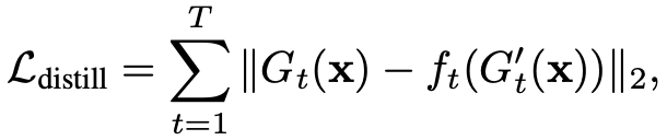 其中,G_t(x) 和 G′_t(x) 是学生和教师模型中第 t 个被选层的中间特征激活,T 表示层数。