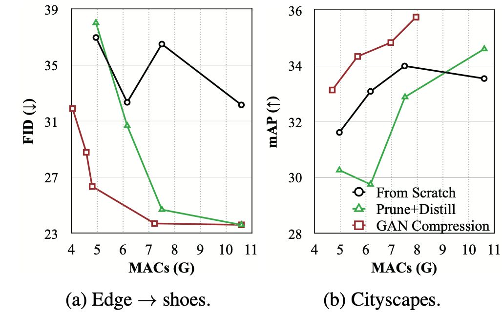 图 6:在 Cityscapes 与 Edges→Shoes 数据集上 pix2pix 的权衡曲线。剪枝与蒸馏方法在大型模型中超出了从头开始训练,然而在模型被急剧压缩时表现较差。
