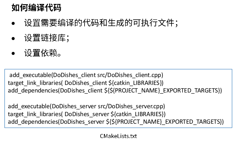 设置需要编译的代码和生成的可执行文件;设置链接库;设置依赖。CMakeLists.txt