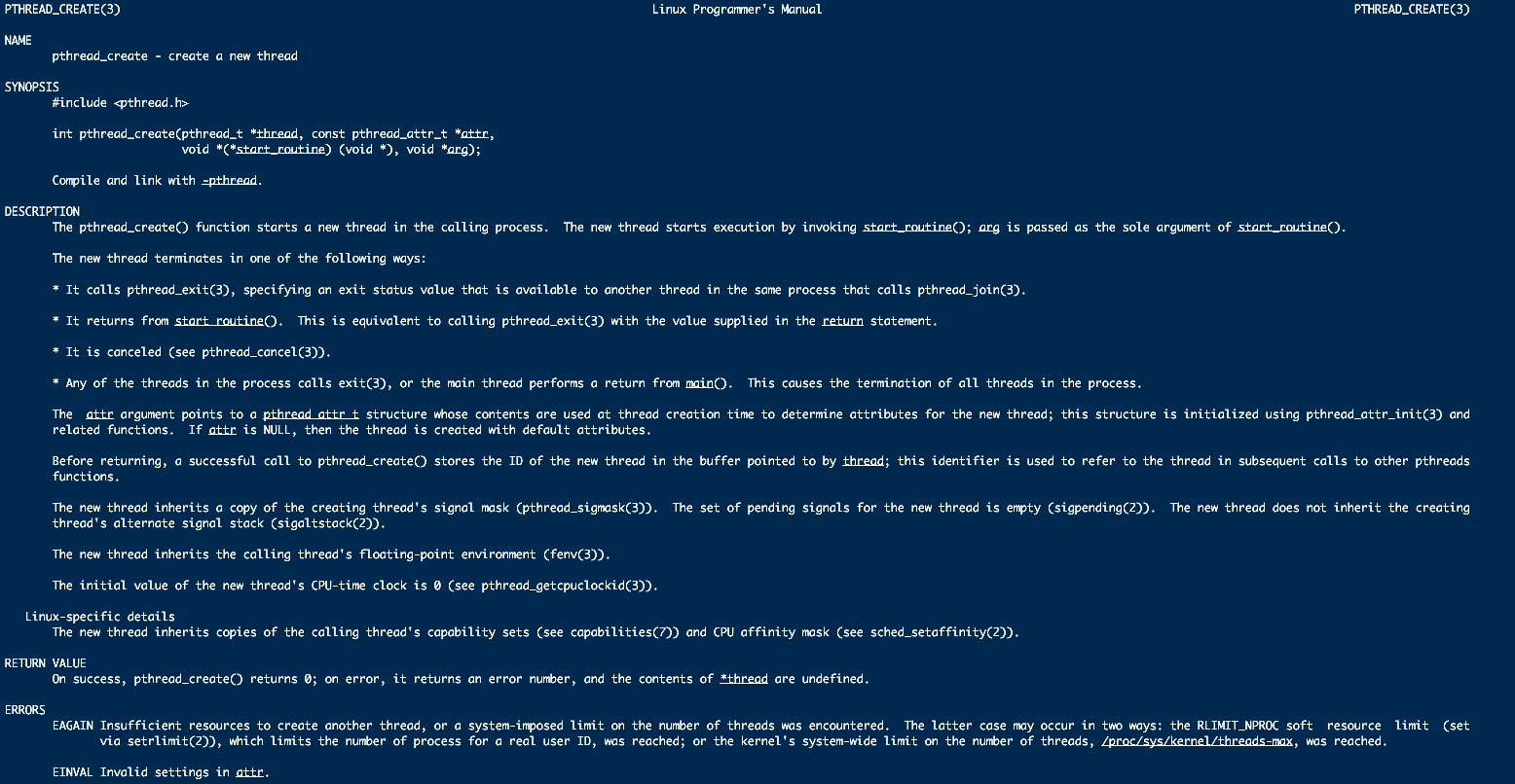 根据man配置的信息可以得出pthread_create会创建一个线程,这个函数是linux系统的函数,可以用C或者C++直接调用,上面信息也告诉程序员这个函数在pthread.h, 这个函数有四个参数: