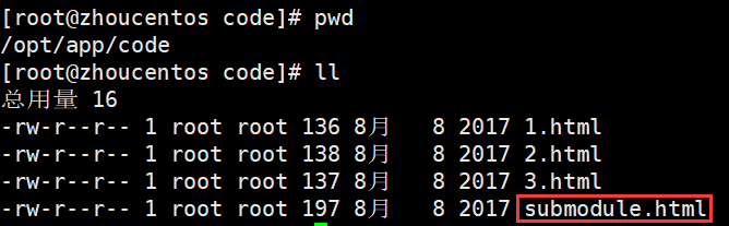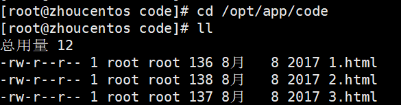 在/opt/app/下新建一个名为code的目录,并把准备好的几个html页面放在这里(HTML页面随意准备,网页保存都可以)