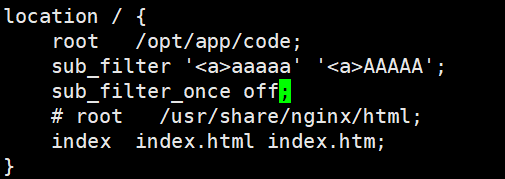 配置语法:sub_filter_once on | off;(用于控制是匹配html代码里面的第一个还是匹配所有指定的字符串,on:只匹配第一个,off:匹配所有)