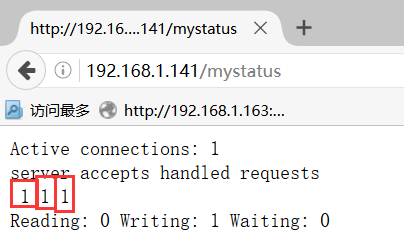 1 1 1 :第一个数代表nginx处理的握手的总的次数,第二个数代表nginx处理的连接数,第三个数代表总的请求数(正常情况应该握手数和连接数相等,即请求没有丢失)