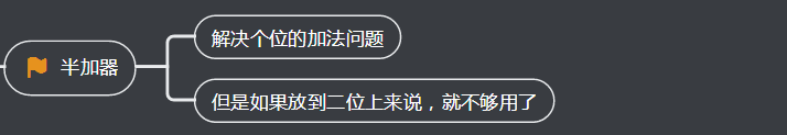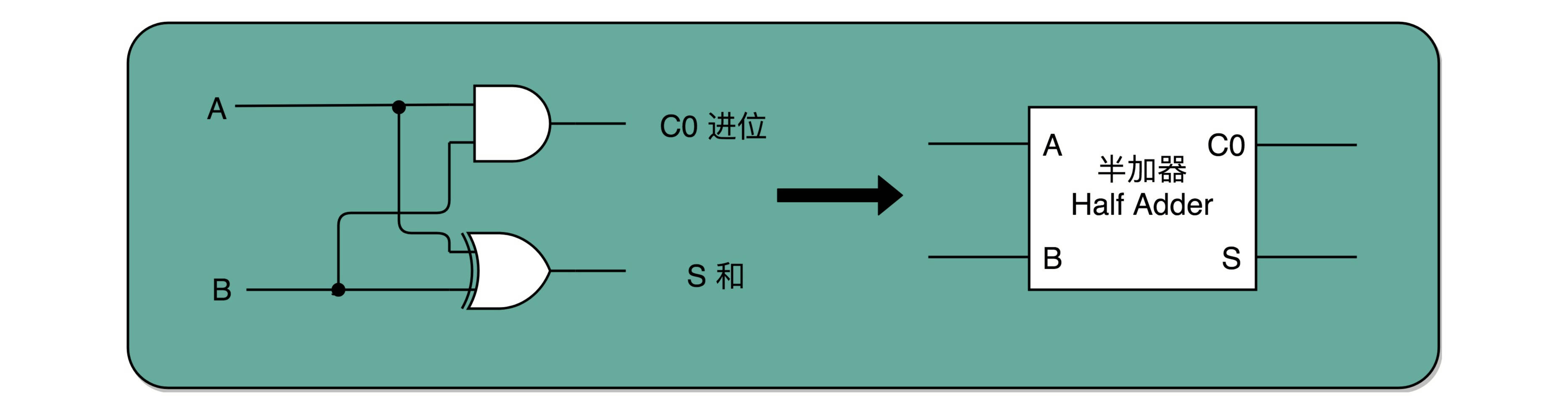所以、通过一个异或们计算机出个位,通过一个与或门计算出是否仅为,我们就通过电脑算出了一位数的加法、于是、我们把两个门电路打包,给它取一个名字,就叫做半加器