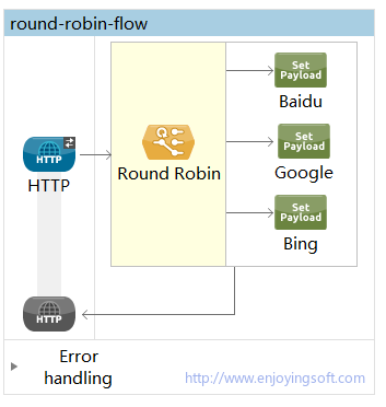 Mule的Round-Robin组件也是类似的思路,轮询执行Flow中的分支路径。举例如下,我们接收到用户的检索请求,每次请求我们使用不同的执行路径,第一次使用Bing搜索,第二次使用Google,第三次使用Baidu。