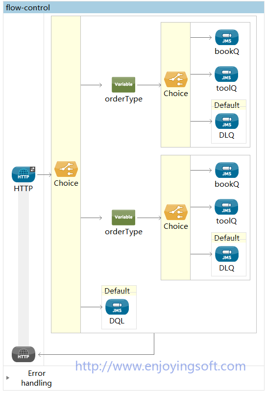 Mule ESB最基本的路由组件就是Choice组件,组件类似于我们在编程语言中的if/esle if/else。订单的格式是存放在Message Inbound Properties中的。这里就使用Choice组件来判断订单的格式。