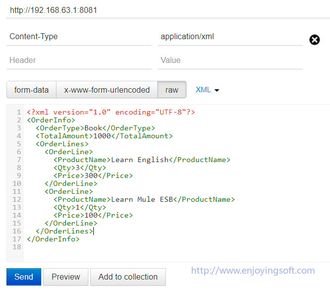通过Postman的Preview可以看到,实际上Http的Request头信息上设定了Content-Type字段为application/xml。