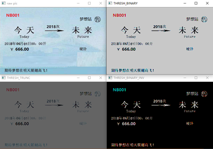 THRESH_BINARY,thresh=100,maxval=200,大于阈值限定为200,小于阈值清零。