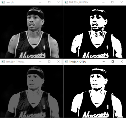 使用大津法时阈值可以不设置或随意设置,函数会自动计算最合适的阈值,输出图像如下。