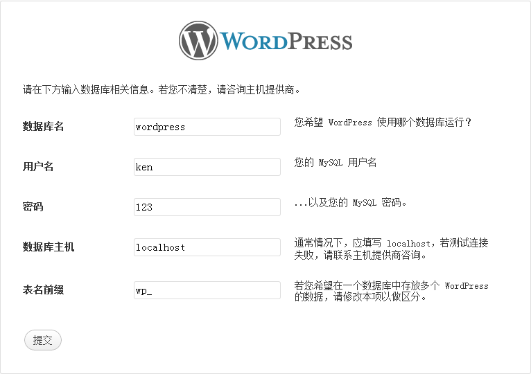 MariaDB [(none)]> grant all on wordpress.* to ken@'localhost' identified by '123';