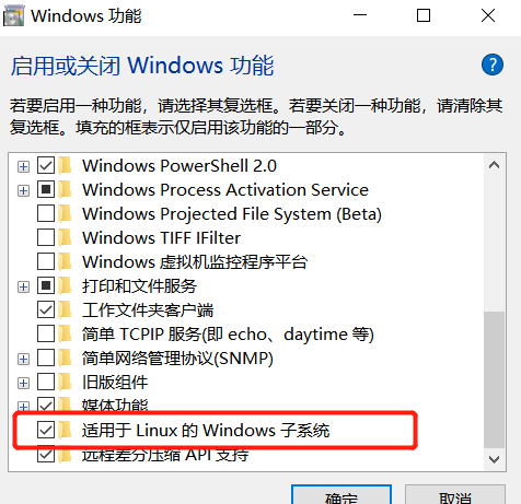 打开控制面板,单击“程序“,然后单击“打开Windows功能打开或关闭”在程序和功能。在这里启用“Windows子系统为Linux(测试版)”列表中的选项,并单击“确定”。