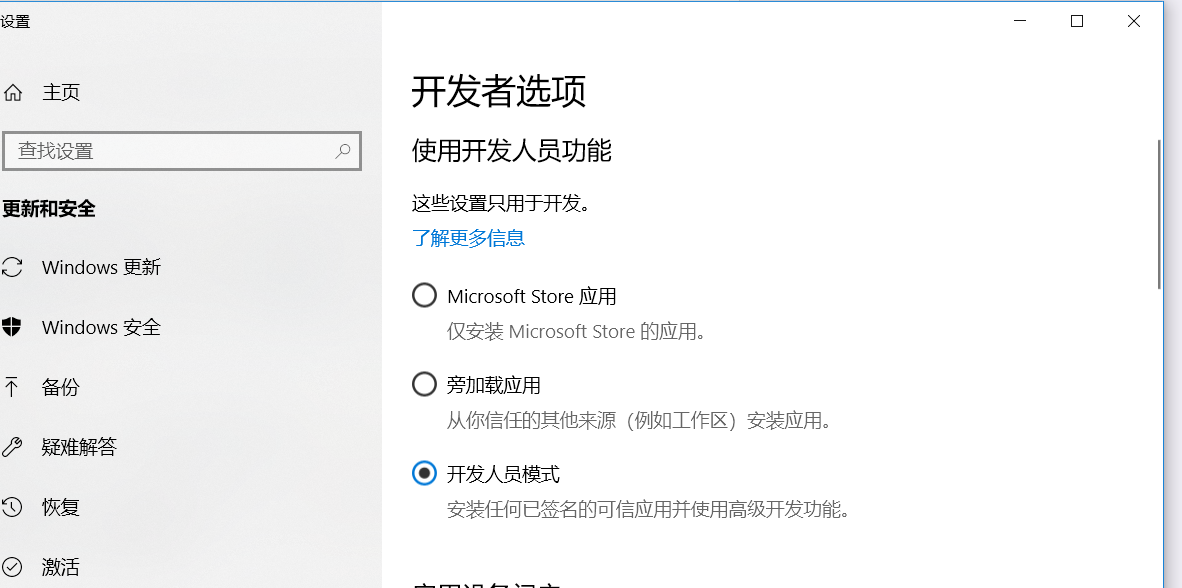 打开设置应用程序和头部更新和安全>对于开发。 在这里启动“开发者模式”开关,使开发者模式。