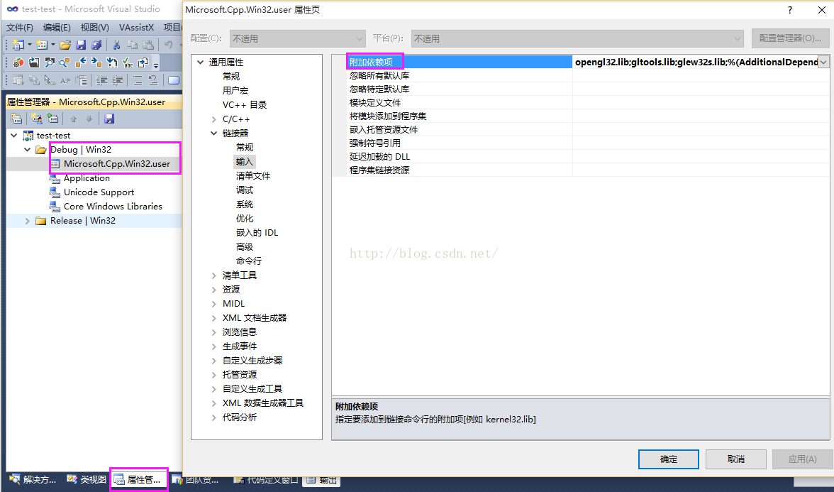添加附加依赖项(第一个图):(这种添加依赖项方式,仅仅对当前test项目生效。为了让其他项目也可以使用这些个.lib文件,所以应该在属性管理器中添加依赖项,具体方式见下面第二个图)