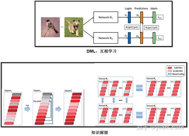 与自学习类似的是互相学习策略中不存在教师模型,与自学习不同的是互相学习的方式通用是多个模型之间的学习,而自学习仅仅只有一个模型。其中DML:互相学习这篇文章就是一种典型的互相学习的方式,DML是在训练过程中,几个需要反向传播的待训学生网络协同学习,互相传递知识。每个互相学习的网络都有一个标准的分类Loss和互学习Loss,其中互学习Loss是一个KL散度。 具体而言,两个网络的softmax输出为p1,p2.则互学习的意义在于,对于Net1(Net2亦然),对了提高其泛化能力,使用Net2的p2作为一种后验概率,然后最小化p1,p2的KL散度。而知识蒸馏这篇文章更像是一种广义上的互相学习方法,该文章的主要是思想是并行地训练多个网络,对所有网络的参数进行重要性排序,并另一个并行网络中的更有效的权重替换到当前网络的不重要权重的位置,在训练过程中通过这种重要性权重的互相替换实现互相学习。