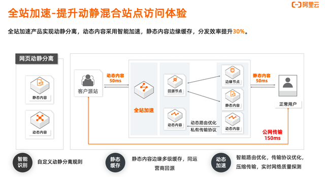 在此基础之上,针对很多企业的动静内容混合的情况,阿里云全站加速面向用户提供更好的多维度增值能力,可以实现自定义动静分离,动态内容采用智能路由,进行传输协议优化,压缩传输,实时网络质量探测,而静态内容边缘多级缓存,同运营商回源,以此保障用户整体访问质量可以达到最优,分发效率提升30%,提速效果明显。
