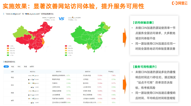 对该官网来说,它的用户访问体验上的提升也十分明显,下图左侧是未做CDN加速的源站使用单一节点服务全国访问请求,大多数地域访问体验不佳,同时很多处的最慢响应时间达15秒左右,接近触发“站点不可用”的单项否决指标;下图右侧同一源站使用CDN加速后在同一时刻全国各地访问体验显著改善,最慢响应时间、平均响应时间明显缩短,服务可用性得到提升。