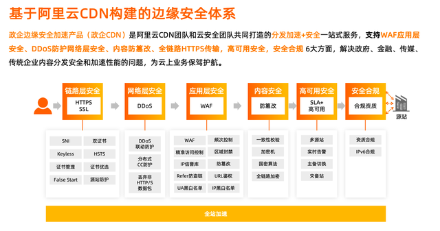 解决方案的基础是阿里云CDN多年沉淀的强大的内容分发能力,在安全层面,解决方案主要具备WAF应用层安全、DDoS防护网络层安全、内容防篡改、全链路HTTPS传输,高可用安全,安全合规六大方面的能力,进而构建了完整的边缘安全体系。