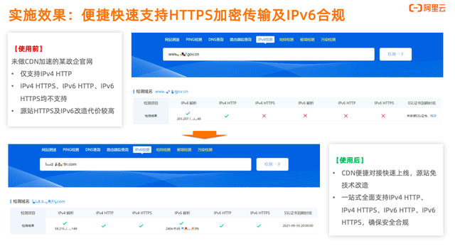 某官网在没有实施HTTPS和IPv6合规的改造之前,很多内容是不支持的,仅仅是支持IPv4和HTTP服务,这就意味着在合规性上可能会存在一些问题。同时,如果网站要进行改造的话,成本也比较高。而当这个官网使用了CDN加速服务之后,通过CDN便捷对接快速上线,避免源站技术改造,即可一站式支持IPv4 HTTP、IPv4 HTTPS、IPv6 HTTP、IPv6 HTTPS确保合规安全。