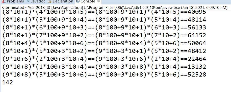 package 一三年省赛真题; public class Year2013_t3 { /** * 假设 a b c d e 代表1~9不同的5个数字(注意是各不相同的数字,且不含0) 能满足形如:ab * cde = adb * ce 这样的算式一共有多少种呢? * */ public static void main(String[] args) { int count = 0; for (int a = 1; a < 10; a++) { for (int b = 1; b < 10; b++) { if (a!=b) { for (int c = 1; c < 10; c++) { if (c!=a&&c!=b) { for (int d = 1; d < 10; d++) { if (d!=a&&d!=b&&d!=c) { for (int e = 1; e < 10; e++) { if (e!=a&&e!=b&&e!=c&&e!=d) { int x = (a*10+b)*(c*100+d*10+e); int y = (a*100+d*10+b)*(c*10+e); if (x==y) { count++; System.out.printf("(%d*10+%d)*(%d*100+%d*10+%d)==(%d*100+%d*10+%d)*(%d*10+%d)==%d\n",a,b,c,d,e,a,d,b,c,e,x); } } } } } } } } } } System.out.println(count); } }
