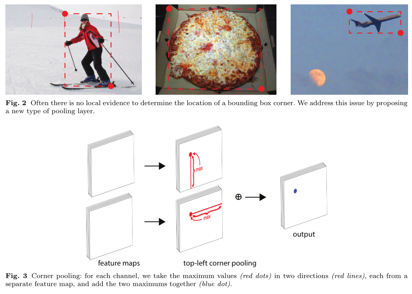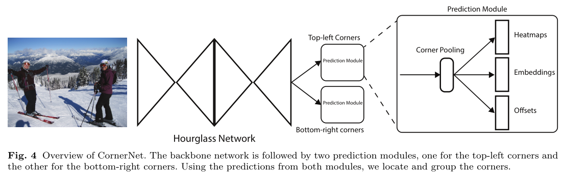 如上图fig1,经过特征提取主干网络(主干网络为Hourglass-104)后分为两个分支(两个分支分别接前面提到的corner pooling,随后细谈),一个分支生成目标左上点热力图,一个分支生成目标右下点热力图,而此时两个热力图并没有建立联系,因此无法确定两点是够属于同一目标,因此两分支同时生成embeddings,通过判断两个embedding vector的相似性确定同一物体(距离小于某一阈值则划为同一目标)。