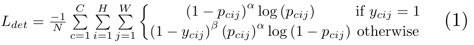 CornerNet的第一个输出headmap用来预测角点的位置。公式(1)是针对角点预测(headmaps)的损失函数,是修改后的focal loss。