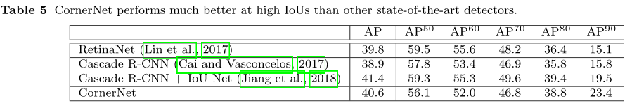 上表Table5将cornernet分别与RetinaNet、Cascade R-CNN、IoU-Net在高iou阈值下进行ap对比,证明“好的检测期的边界框与gt更贴近”