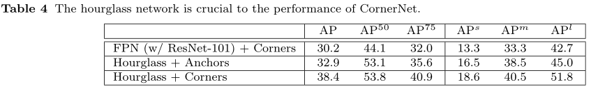 上表Table4是关于主干网络选择的消融实验,该实验分别以fpn为主干网络+corner检测方式,hourglass-104为主干网络+anchor检测方式,hourglass-104为主干网络+corner检测方式,最后说明本文组合方式效果最佳。