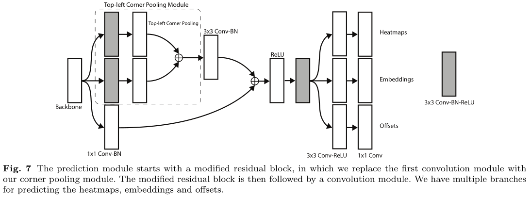 Figure7是Figure4中预测模块的详细结构,该结构包括corner pooling模块和预测输出模块两部分,corner pooling模块采用了类似residual block的形式,有一个skip connection,虚线框部分执行的就是corner pooling操作,也就是Figure6的操作。