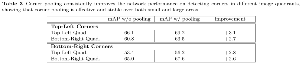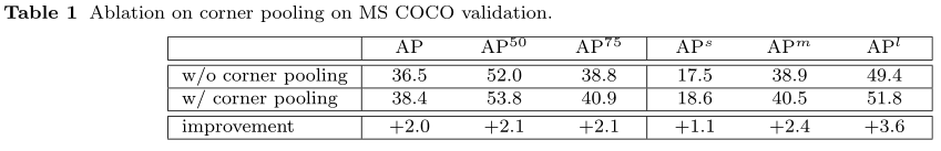 上表Table1是关于是否添加corner pooling的消融实验,可以看出第二行(添加)提升效果明显,尤其在大目标上